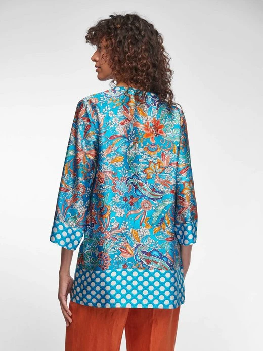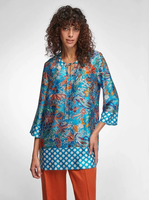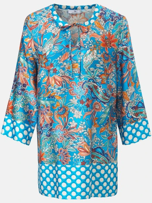Tunika von PETER HAHN mit 3/4-Arm. Gerader Style mit Rundhals-Ausschnitt und einer V-Öffnung mit Bindebändchen. Aus fließendem, glänzendem Viskosegewebe mit Floral-Print und platzierten Punkte-Bordüren an Armabschluss, Ausschnittblende und Saum. 100% Viskose. Jede Tunika ein Unikat. Länge ca. 72 cm. Dieser Tunika ist maschinenwaschbar